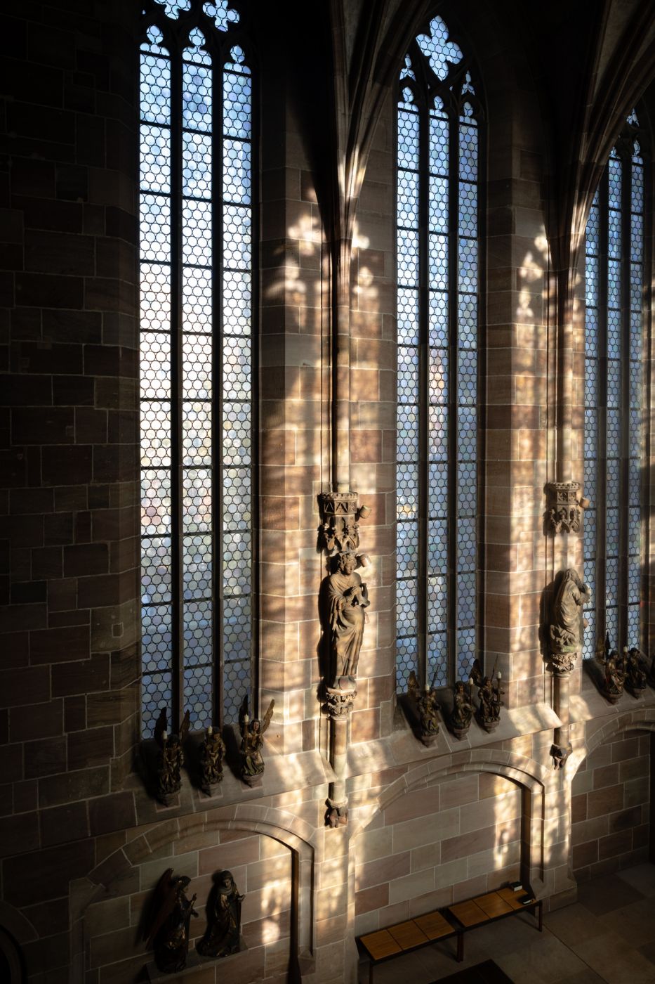 Die dreischiffige Frauenkirche war die erste gotische Hallenkirche Frankens. Peter Parler, höchstwahrscheinlich Baumeister der Frauenkirche, schuf für die Präsentation der Reichsinsignien einen Mittelpunkt im Innenraum sowie den Balkon an der Westfront, auf dem das Nürnberger Christkind den Prolog zur Eröffnung des Christkindlesmarktes spricht. Bedeutende Kunstwerke in der Frauenkirche sind die drei ältesten Glasmalereien Nürnbergs aus dem von Karl IV. gestifteten Kaiserfenster, der Tucheraltar, von einem unbekannten Meister um 1445 geschaffen und das wichtigste Zeugnis Nürnberger Tafelmalerei vor Albrecht Dürer, sowie zwei Epitaphien des berühmten Nürnberger Bildhauers Adam Kraft und Tafelgemälde von Michael Wolgemut.